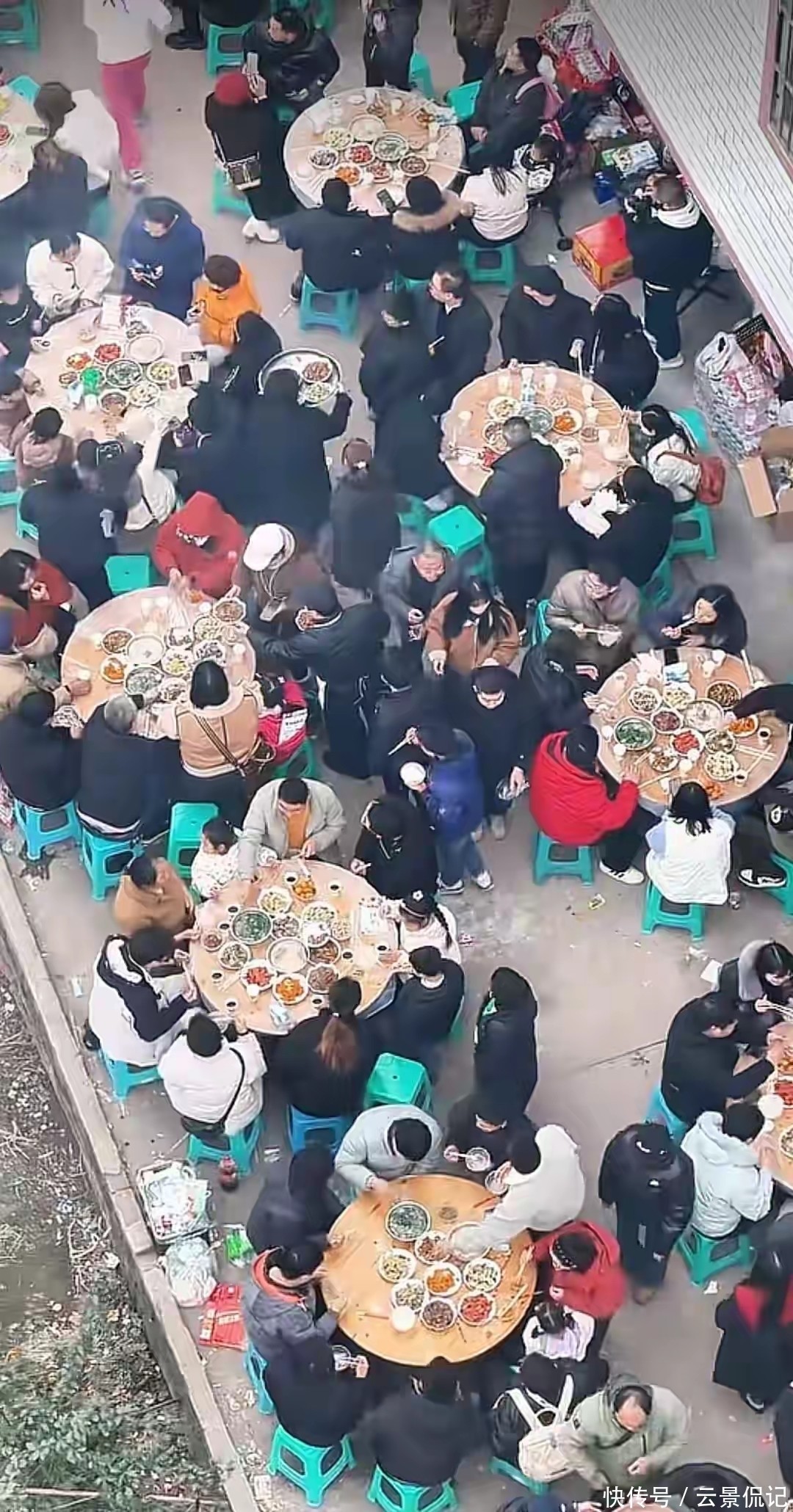 现场早已不再是简单的农家宴席,俨然变成了一场大型民俗嘉年华。院子里摆不下桌椅,人们便在田埂上搭起长桌;碗筷不够,成箱的一次性餐具被紧急搬运进场;厨师人手不足,自称有厨艺经验的网友直接挽起袖子进厨房掌勺。