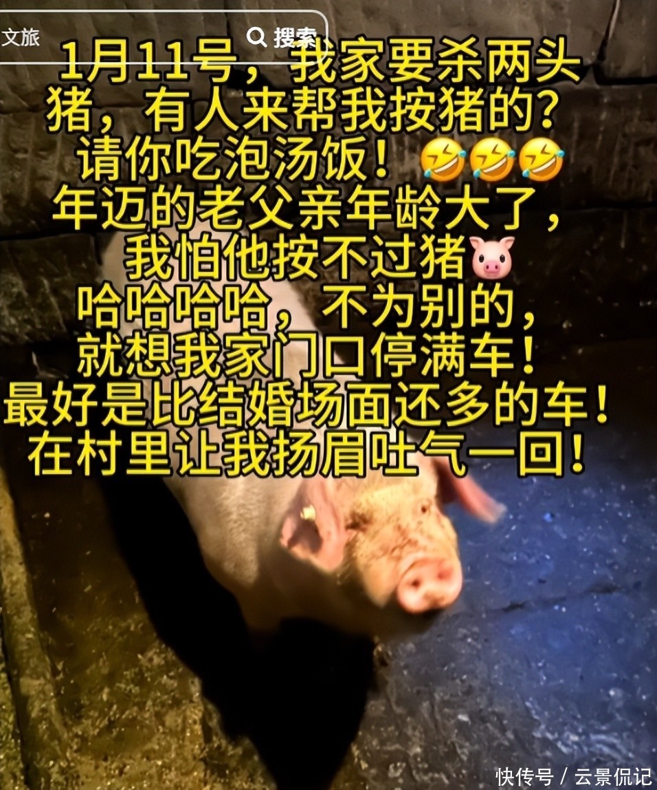 “1日,我家要杀两头猪,有没有人来帮忙按猪?请你吃刨猪汤!我爸年纪大了,怕他一个人搞不定。”