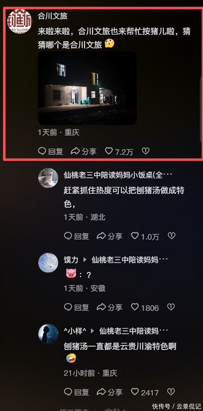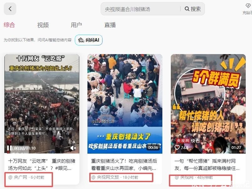 但这仅仅是开始。连续两天,“合川呆呆”“刨猪汤”“杀年猪”等相关话题牢牢占据各大平台热搜前三位置。截日晚,仅#合川呆呆刨猪汤#单个话题播放量已突万大关。